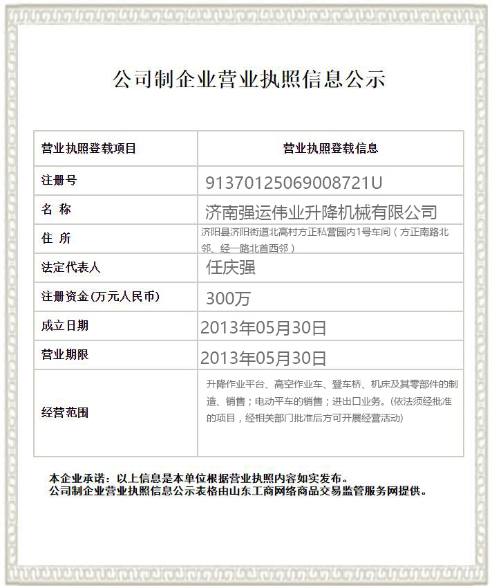 地址:山東省濟(jì)南市濟(jì)北開(kāi)發(fā)區(qū) 銷(xiāo)售熱線(xiàn):0531-81176456 手機(jī):13256767555 QQ:987397168 升降平臺(tái) | 鋁合金降機(jī) | 登車(chē)橋 營(yíng)業(yè)執(zhí)照