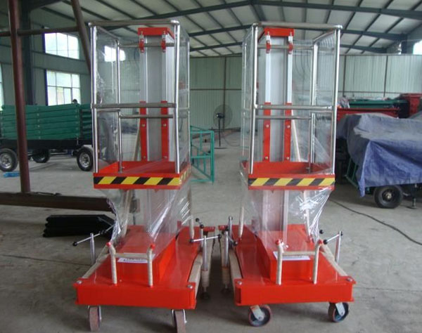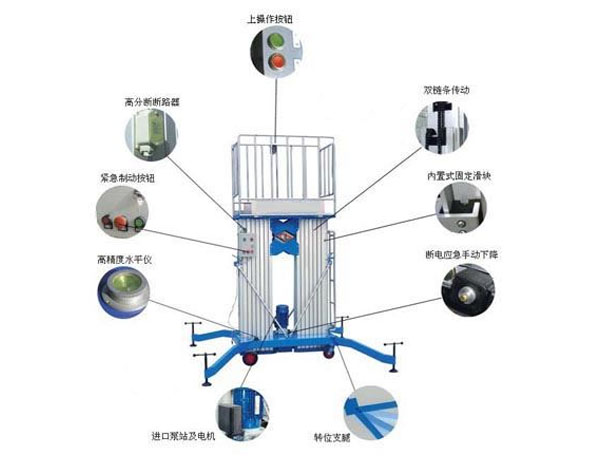 雙柱鋁合金升降機(jī):升降動(dòng)力分為220V、 380V,或電瓶動(dòng)力源,特殊環(huán)境也可采用防爆泵站及防爆電器。升高4——10米,載重100-150公斤。主體采用高強(qiáng)度優(yōu)質(zhì)鋁合金材料,具有造型美觀、體積小、重量輕、升降平穩(wěn)、安全可靠等優(yōu)點(diǎn)。廣泛用于工廠、賓館、餐廳、車站、影劇院、展覽館等場(chǎng)所,是保養(yǎng)機(jī)具、油漆裝修、調(diào)換燈具、電器、清潔保養(yǎng)等用途的最佳安全伴侶。
