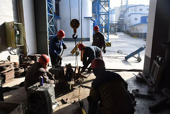 旋窯車間維修工們對(duì)減速機(jī)齒輪進(jìn)行檢修