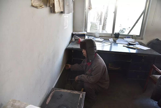 為供料車間辦公室認(rèn)真布線的電工師傅