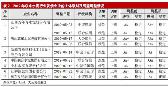 2019年以來,水泥行業(yè)內發(fā)債企業(yè)的級別遷移均為主體級別或展望上調,涉及主體7家。具體來看,級別上調的企業(yè)6家,除1家由AA-調整為AA外,其余5家調整后級別均在AA+以上;展望上調的企業(yè)1家,評級展望由穩(wěn)定調整為正面。級別或展望上調的理由主要包括區(qū)域性政策利好于行業(yè)發(fā)展,收并購促進資源整合,企業(yè)經營業(yè)績顯著提升,資金流動性顯著改善等。