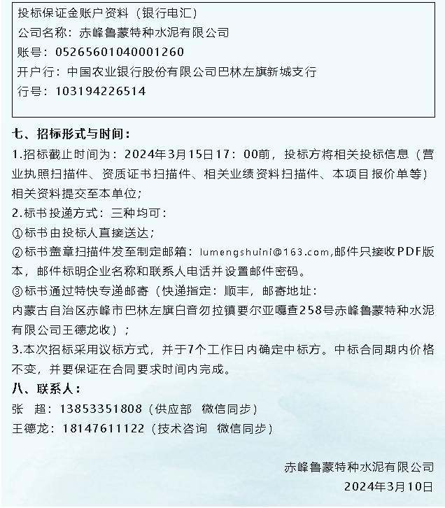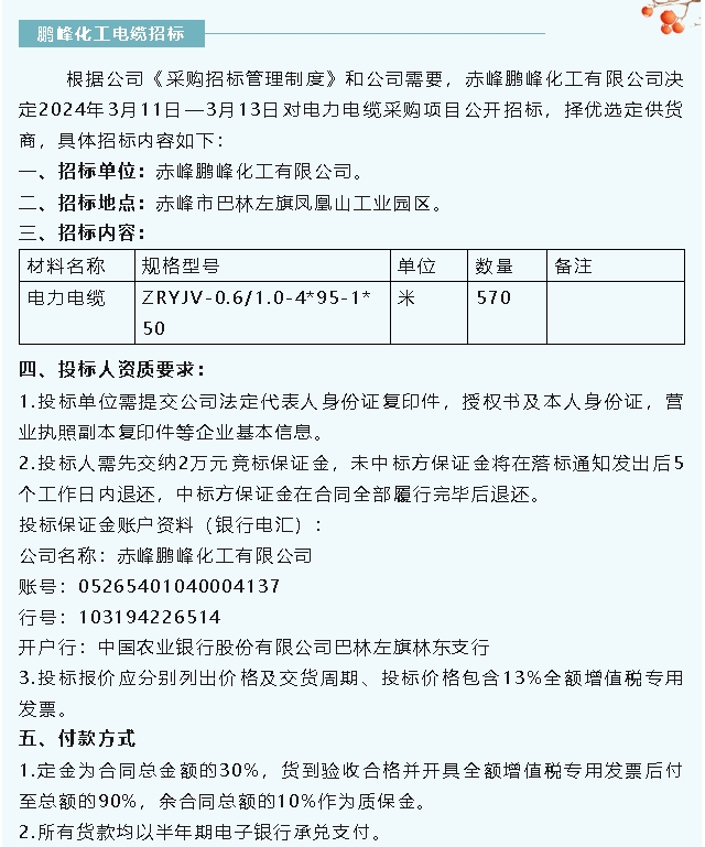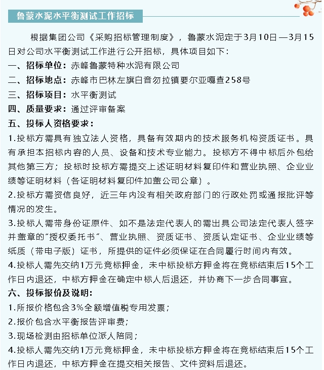 【招標(biāo)公告】魯蒙水泥水平衡測(cè)試工作招標(biāo)、鵬峰化工電纜招標(biāo)