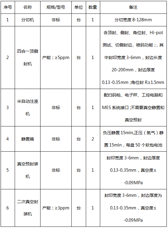 根據(jù)公司《采購招標(biāo)管理制度》,山東重山光電材料股份有限公司定于10月20日—10月30日對(duì)高比能鋰氟化碳電池中試線軟包電池部分設(shè)備招標(biāo),具體要求如下: