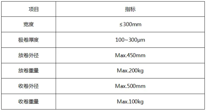 分切機(jī)用于輥壓后道工序,將輥壓好的成卷極片分切成兩個(gè)或者多個(gè)小卷,極片寬度≤350mm,分切寬度為8-128mm,分切速度≥15m/min;刀片為鎢鋼合金刀,刀架為130型??赏ㄟ^更換隔套,實(shí)現(xiàn)不同的分切寬度。