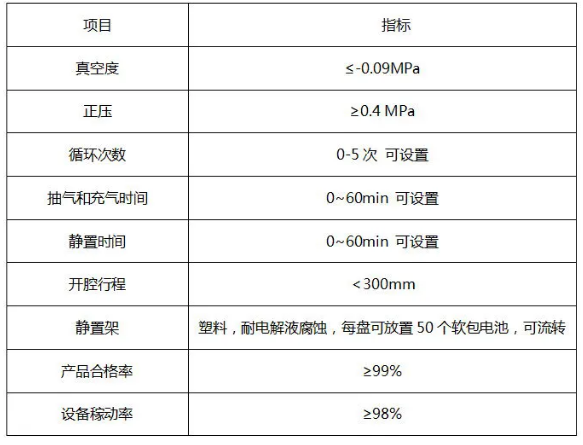 靜置箱用于鋰氟化碳注液后,使電池置于真空和正壓狀態(tài)下,使電解液快速均勻的滲透與電芯中。其主要工作流程是抽真空至-0.098MPa靜置15min,然后充正壓(氮?dú)猓┲?.4Mpa靜置15min,加快電解液滲透。