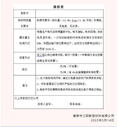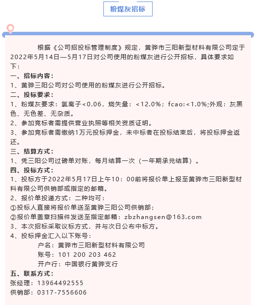 【招標公告】黃驊三陽粉煤灰、礦粉運費招標