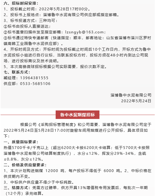 【招標(biāo)公告】魯中水泥高鉻微球、煙煤招標(biāo)