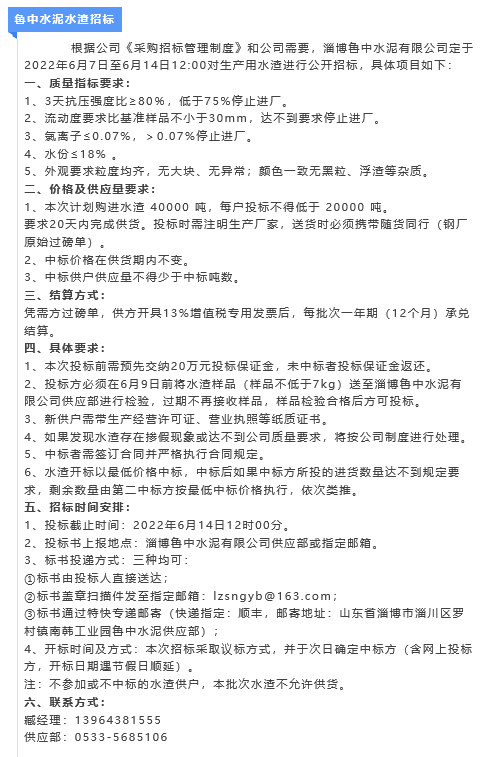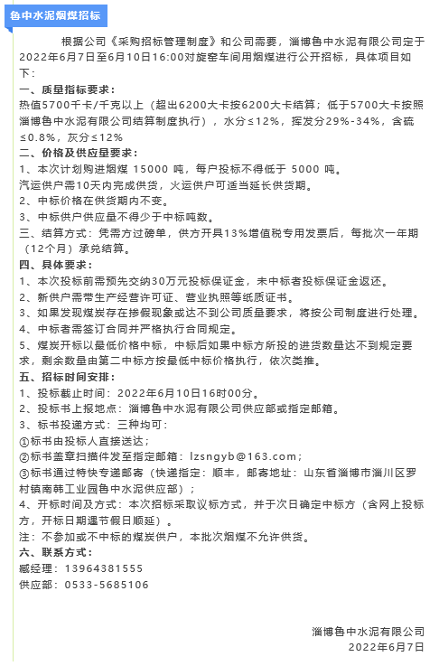 【招標公告】魯中水泥水渣、煙煤招標