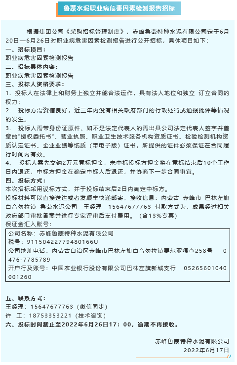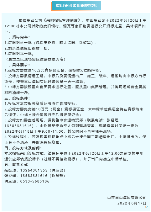 【招標(biāo)公告】重山集團(tuán)廢舊鋼材招標(biāo)、魯蒙水泥職業(yè)病危害因素檢測報告招標(biāo)