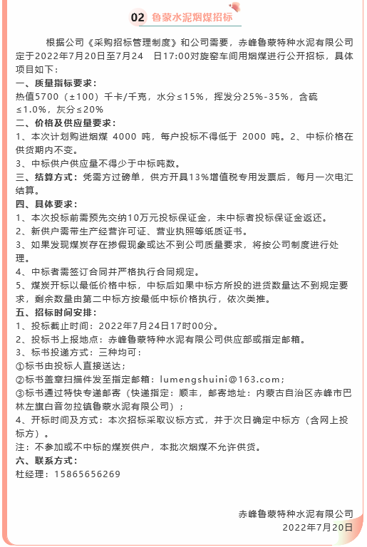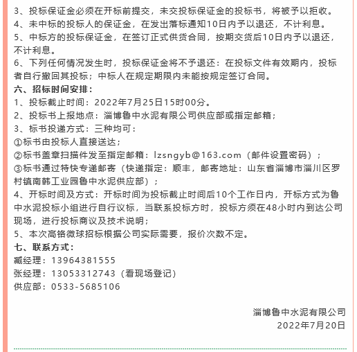 【招標(biāo)公告】魯中水泥高鉻鋼球置換、魯蒙水泥煙煤招標(biāo)