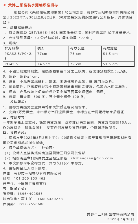【招標(biāo)公告】魯蒙水泥煙煤,黃驊三陽(yáng)球破磨機(jī)襯板、袋裝水泥編織袋,鵬峰化工鋼材招標(biāo)