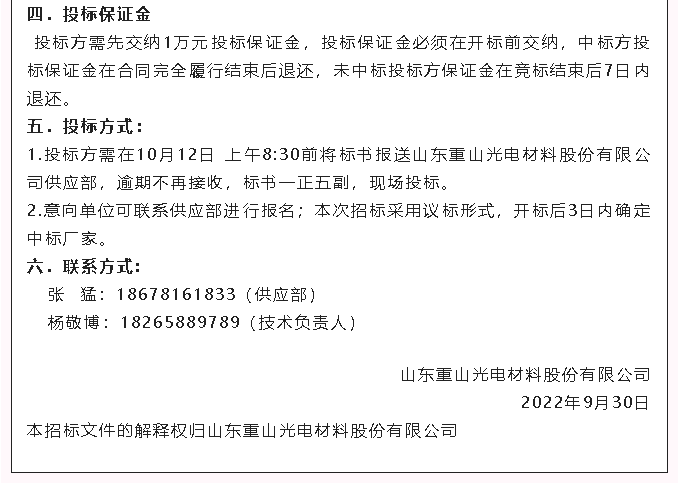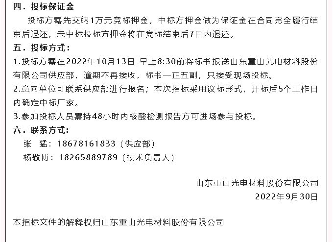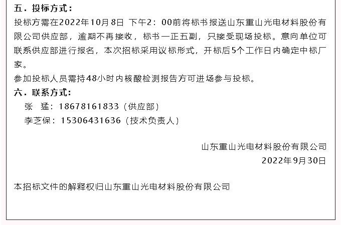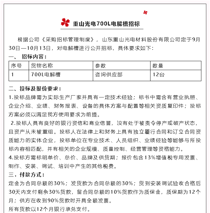 【招標公告】重山光電700L電解槽、車間改造、冷凝器招標