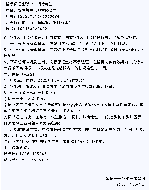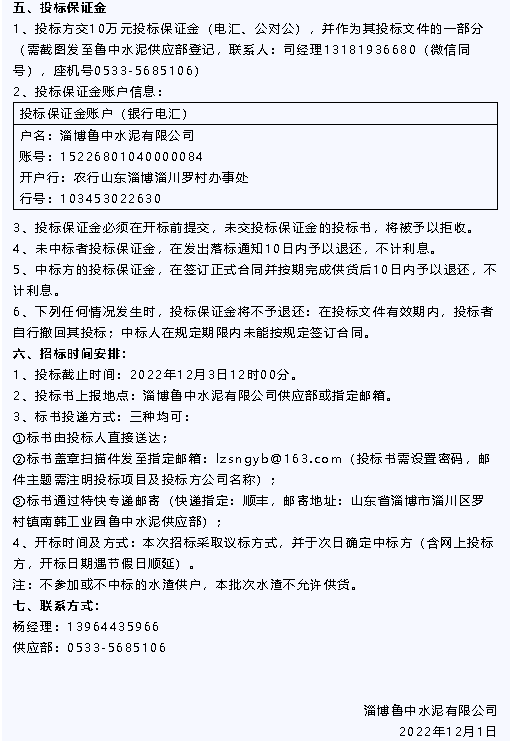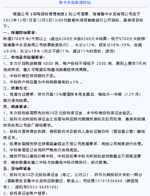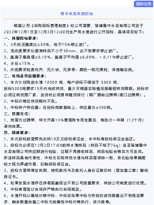 【招標公告】魯中水泥水渣、煙煤招標