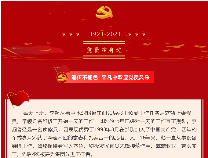【黨員在身邊】 退伍不褪色 平凡中彰顯黨員風(fēng)采—魯中水泥黨支部 李超(前河村)